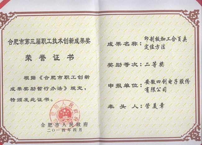 五一勞動(dòng)節(jié)前夕,合肥市政府和合肥市總工會(huì)傳來(lái)喜訊,在合肥市第三屆職工技術(shù)創(chuàng)新成果獎(jiǎng)評(píng)選中,四創(chuàng)電子公司的《印制板加工合頁(yè)夾定位方法》項(xiàng)目獲職工技術(shù)創(chuàng)新成果二等獎(jiǎng);同時(shí),管美章同志獲“合肥市金牌職工”榮譽(yù)稱(chēng)號(hào)。